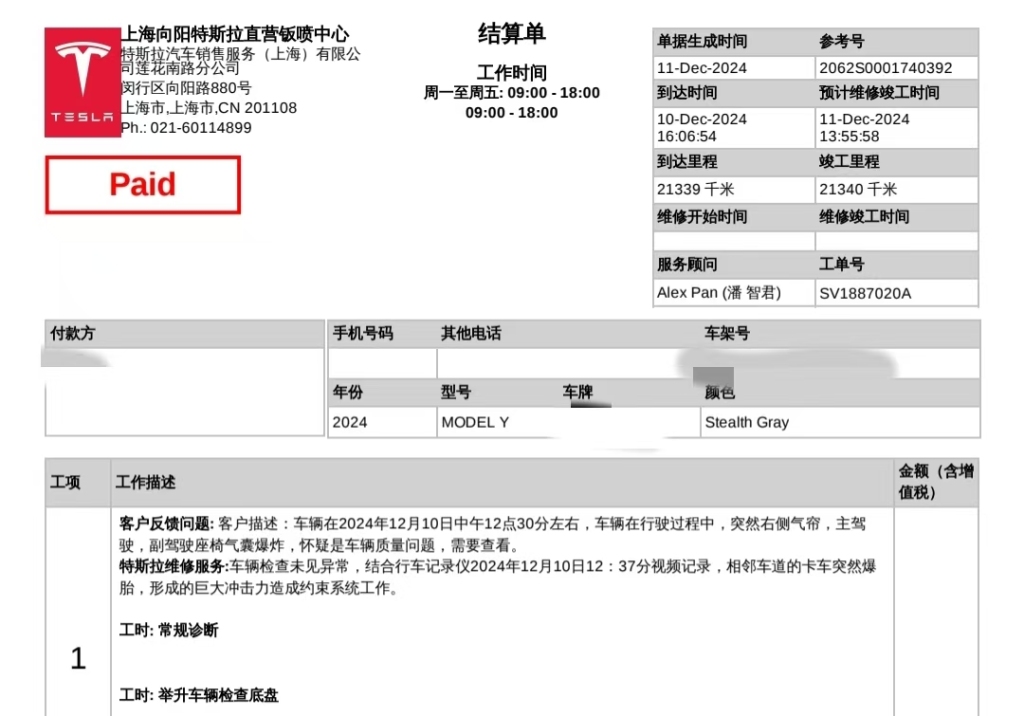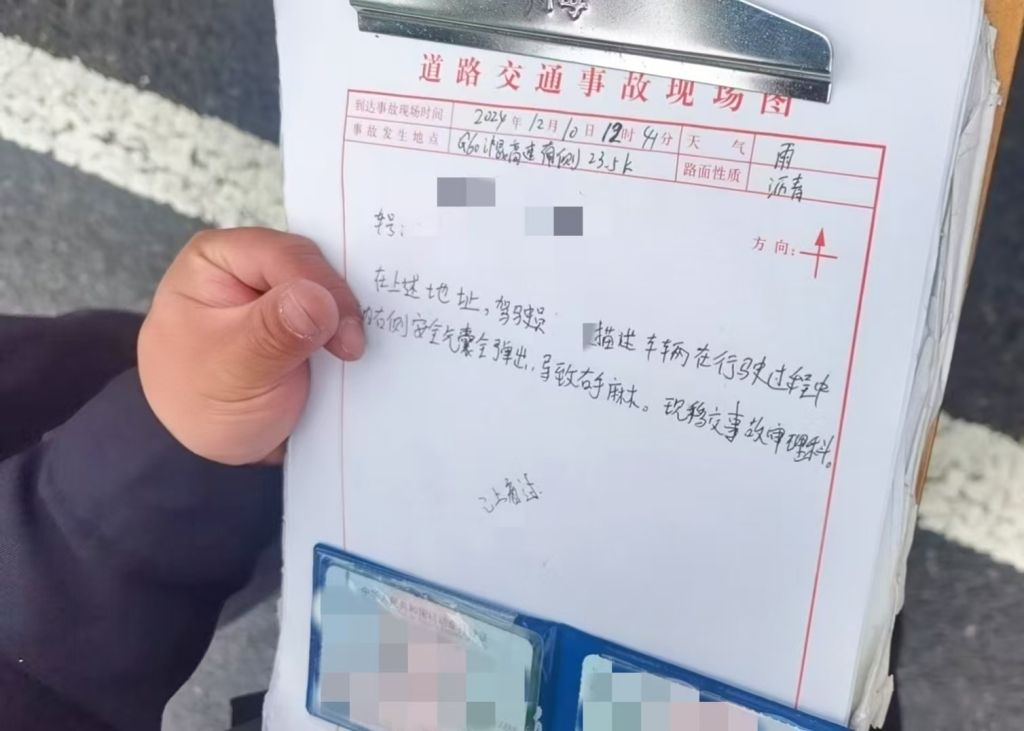 该报告指出,车辆检查未见异常,结合行车记录仪2024年12月10日12:37视频记录,相邻车道的卡车突然爆胎,形成的巨大冲击力造成约束系统工作。