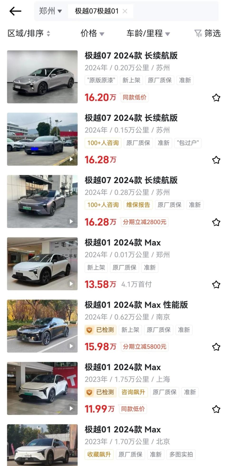 以他此前收购的一辆极越01为例,原车主购入时的价格为20万左右,当时他以不到13万元的价格收购,“可能出了事后,价格会落3万—5万,现在这辆极越的售价调整到11万多。原厂原漆,没有换件,跑了不到一万公里,基本和新的没有区别。”