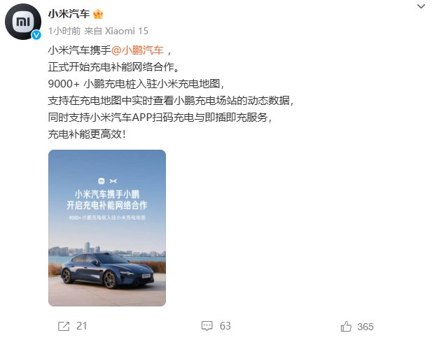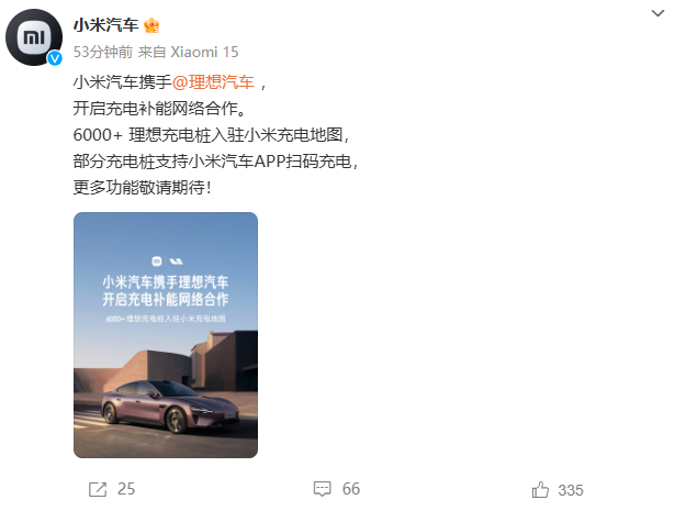 12月25日,小米汽车连续发文称,将携手蔚来、小鹏、理想,正式开始充电补能网络合作。