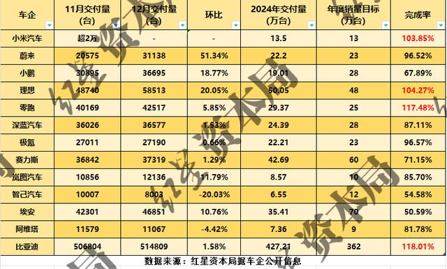 比亚迪、零跑汽车、小米汽车和理想汽车超额完成了2024年的销量目标;蔚来与极氪的完成率超90%;深蓝汽车、岚图汽车与阿维塔的完成率超80%。