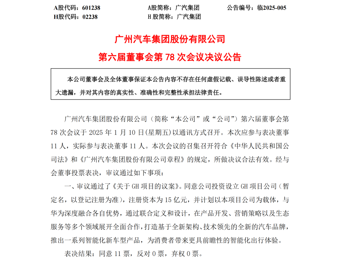广汽集团的公告内容显示,董事会审议通过了《关于GH项目的议案》,同意公司投资设立GH项目公司,注册资本为15亿元,并计划以本项目公司为载体,与华为深度融合各自优势,通过联合定义和设计,在产品开发、营销策略以及生态服务等多个领域展开全面合作,打造基于全新架构、技术领先的全新的汽车品牌,推出一系列智能化新车型产品,为消费者带来更具前瞻性的智能化出行体验。