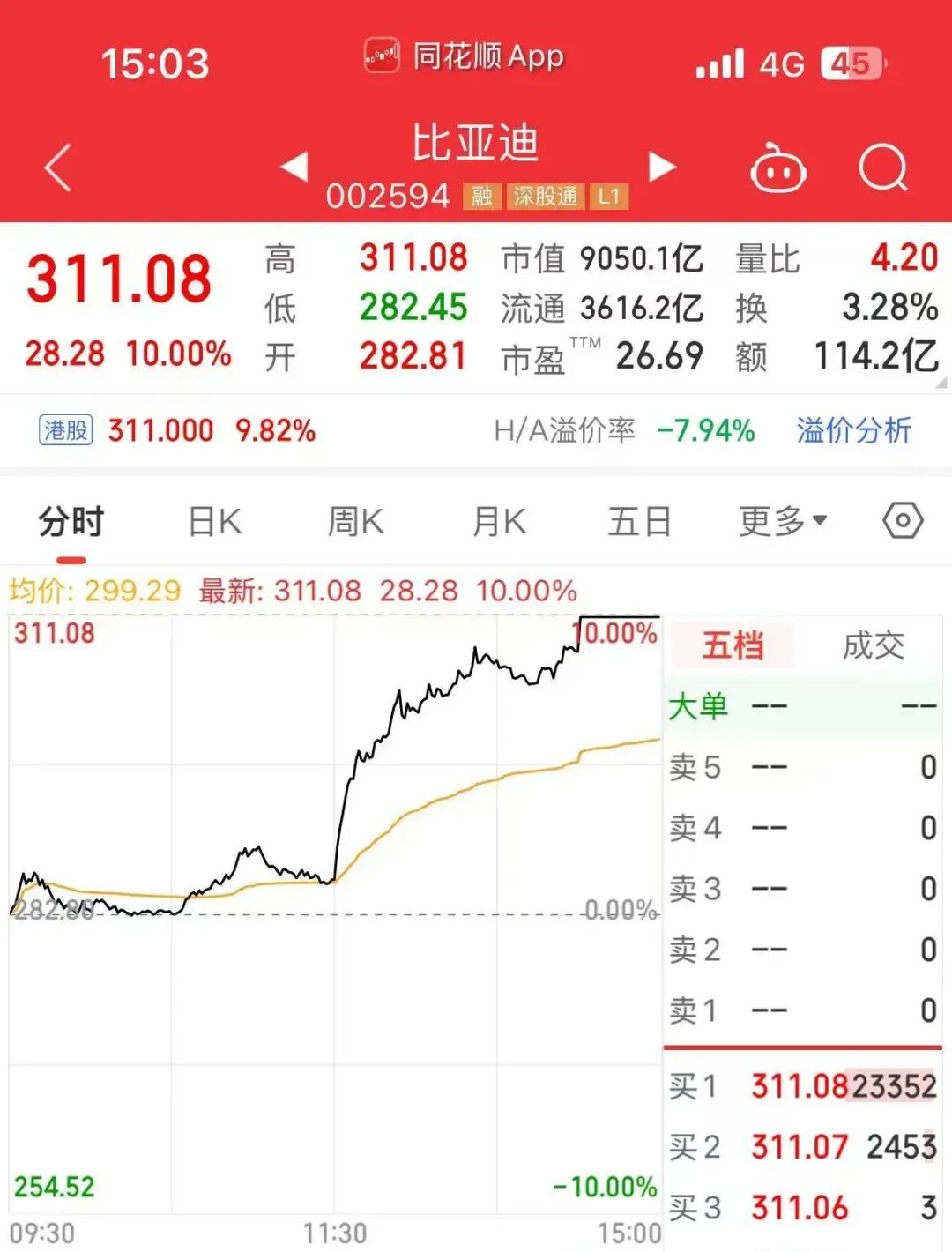 截至收盘,比亚迪(SZ002594)涨停,报311.08元,总市值9050.1亿元,市值一天增长约822亿元。