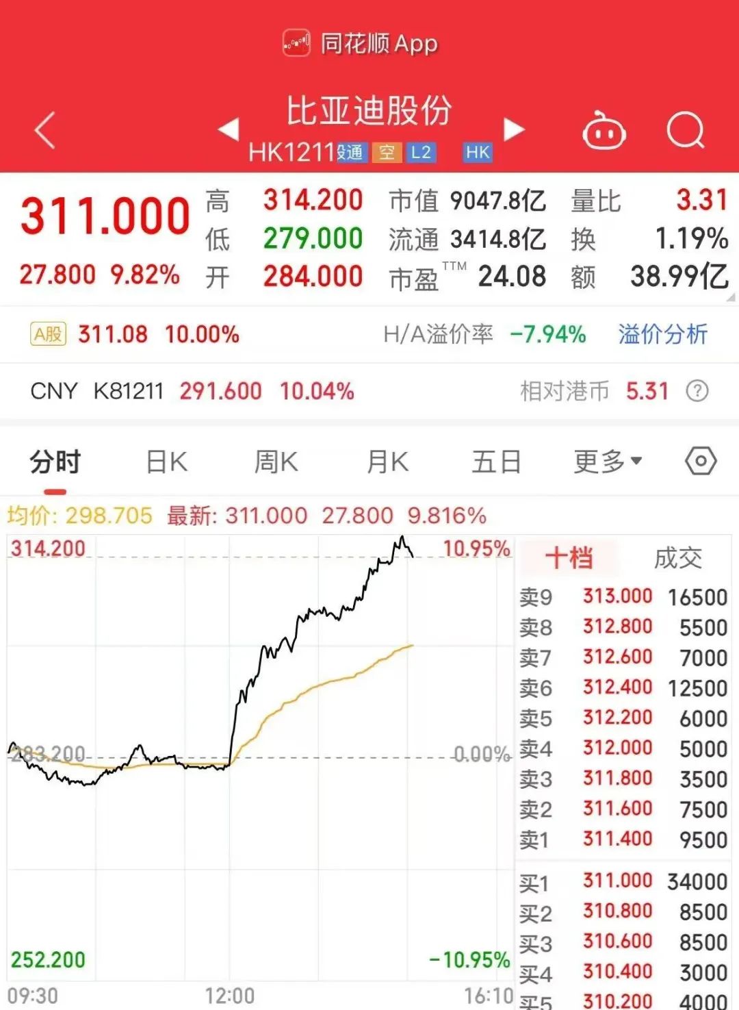 截至发稿,港股比亚迪股份(HK1211)涨9.82%,报311港元,市值9047.8亿港元。