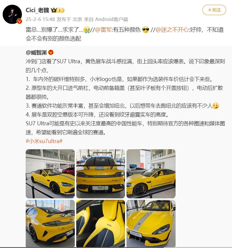 截至目前,虽然关于小米SU7Ultra的具体技术参数和性能数据尚未完全公开,但雷军仿佛开启了“疯狂爆料模式”,接连透露了许多关于小米SU7Ultra的详细信息,比如车身颜色、车标采用黄金打造、汽车内饰等。对于雷军的爆料,小米的高管们纷纷出面“喊停”,小米汽车市场部副总经理魏思琪转发表示:“雷总…别爆了…求求了…”