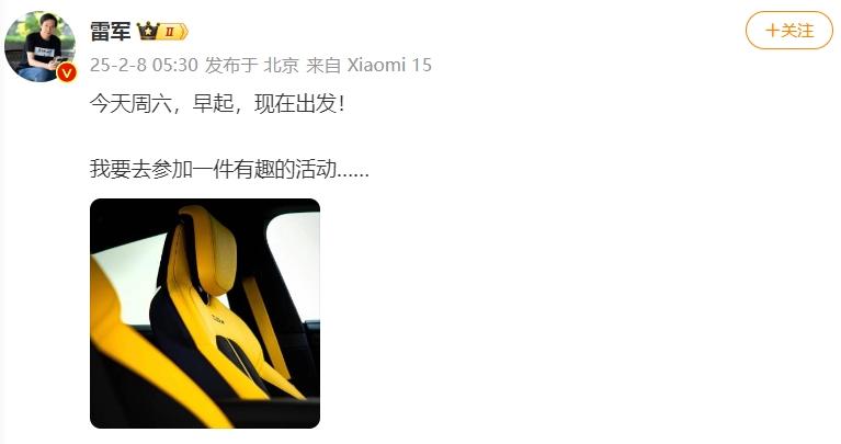 2月8日,雷军发布微博,称“今天周六,早起,现在出发”“我要去参与一件有趣的活动”,不过其并未透露具体活动内容。但在配图中,雷军展示了小米SU7Ultra的内饰照片。