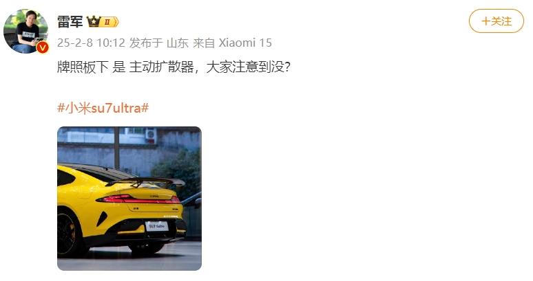 随后,雷军再次发布微博:牌照板下是主动扩散器,大家注意到没?