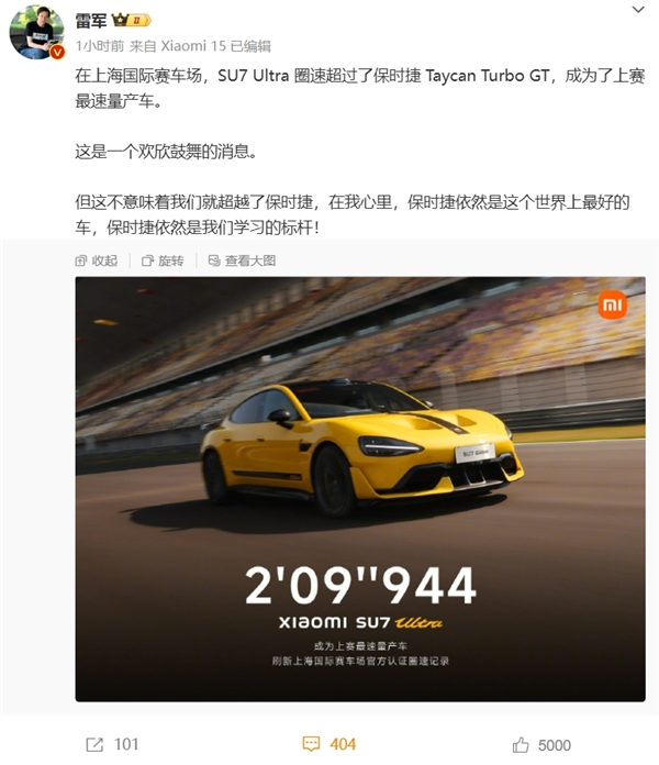 小米CEO雷军发文:在上海国际赛车场,SU7 Ultra圈速超过了保时捷Taycan Turbo GT,成为了上赛最速量产车。