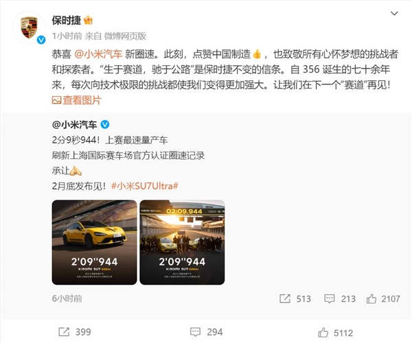 保时捷表示:“恭喜 @小米汽车 新圈速。此刻,点赞中国制造,也致敬所有心怀梦想的挑战者和探索者。‘生于赛道,驰于公路’是保时捷不变的信条。自356诞生的七十余年来,每次向技术极限的挑战都使我们变得更加强大。让我们在下一个‘赛道’再见! ”