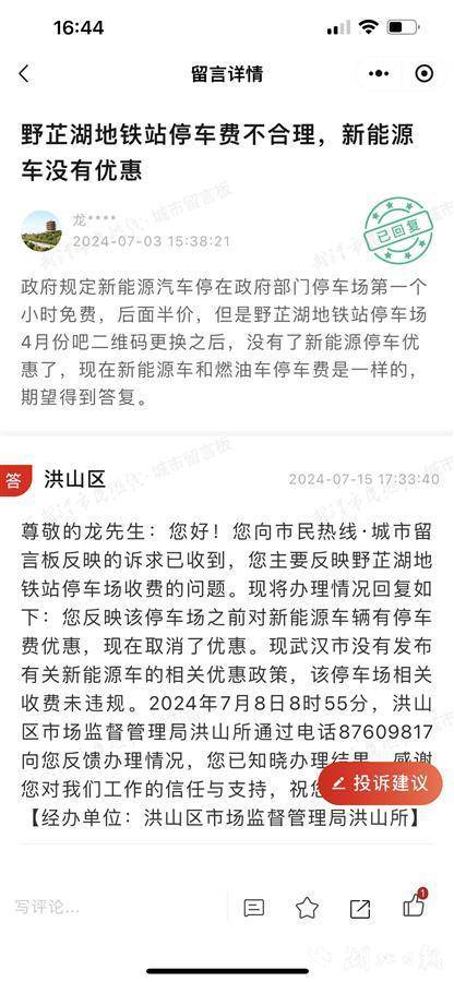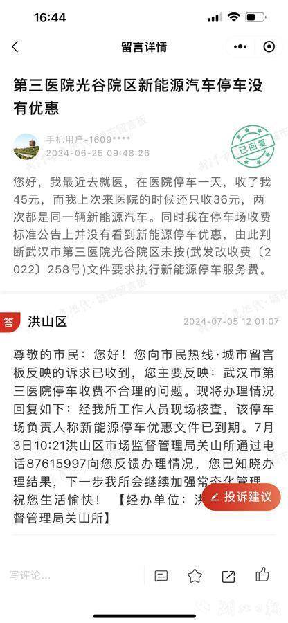 许多武汉市民对新能源车停车优惠政策一直关注。2024年,网友龙先生在武汉城市留言板留言:“政府规定新能源汽车停在政府部门停车场第一个小时免费,后面半价,但是野芷湖地铁站停车场更换二维码后,没有优惠了……”另一名网友同样留言:“我最近去就医,在医院停一天车收费45元,而我上次来只收了36元,两次都是同一辆新能源汽车。同时我在停车场收费标准公告上并没有看到新能源停车优惠,由此判断该医院未按2022年文件执行停车优惠……”经办单位均回复,新能源停车优惠文件已到期了。