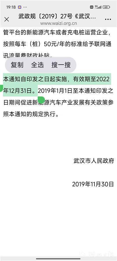 经查询,2019年,武汉市政府出台《武汉市人民政府关于促进新能源汽车产业发展若干政策的通知》(以下简称2019年文件),明确实行政府定价的停车场及市政道路路内停车位,新能源汽车实行1小时(含)内停车免费,超过1小时停车费减半收费。该文件有效期至2022年12月31日。2022年6月,武汉市发改委发布《市发展改革委关于动态调整政府定价的经营服务性收费标准清单的通知》(以下简称2022年文件),在武汉市政府定价的经营服务性收费目录清单中引用2019年文件,虽提及新能源车停车优惠,却未明确标注政策截止日期。