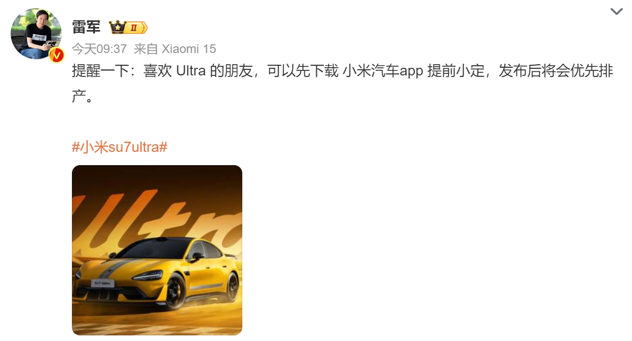 2月23日,雷军发文称:“喜欢 Ultra 的朋友,可以先下载小米汽车App提前小定,发布后将会优先排产。”