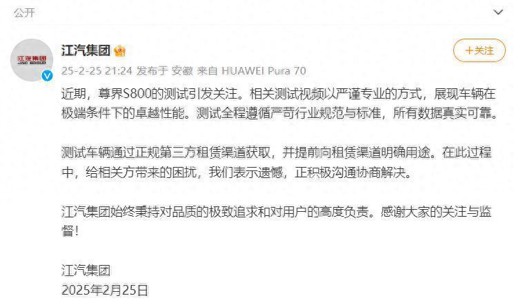 江汽集团始终秉持对品质的极致追求和对用户的高度负责。感谢大家的关注与监督!