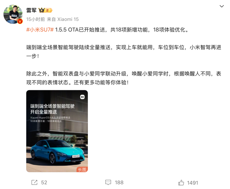 2月25日晚间,小米创办人、董事长兼CEO雷军发布微博称:“小米SU71.5.5 OTA已经开始推送,新增18项功能,18项体验优化。”