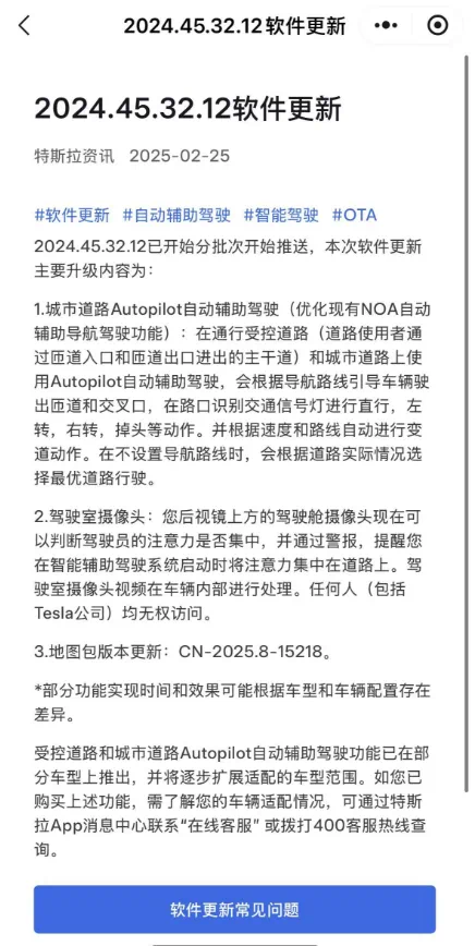 2月25日,特斯拉发布资讯显示,特斯拉将为中国客户分批次更新软件,包括推出城市道路Autopilot自动辅助驾驶功能,优化了现有NOA自动辅助导航驾驶功能。