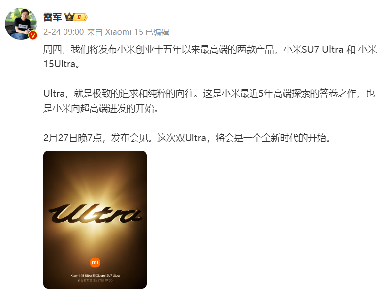 2月24日,雷军在其账号宣布2月27日晚7点将发布小米创业十五年以来最高端的两款产品,小米SU7 Ultra 和 小米15Ultra,并表示这是小米最近5年高端探索的答卷之作,也是小米向超高端进发的开始。