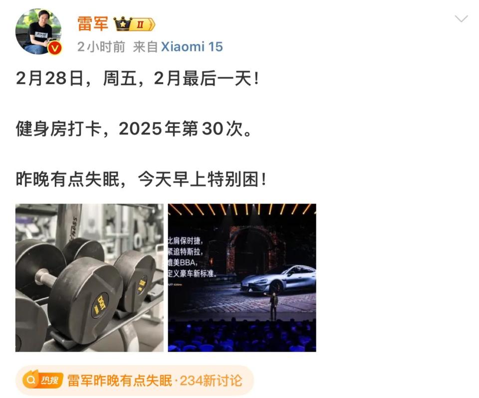 2025年2月28日,小米集团创始人雷军在社交媒体发文称“昨晚失眠了”,并晒出清晨健身打卡照片。这一动态迅速引发关注,其背后是小米首款超高端车型SU7 Ultra的惊人销售表现——开售仅2小时,订单量突破1万辆,直接完成全年销量目标。