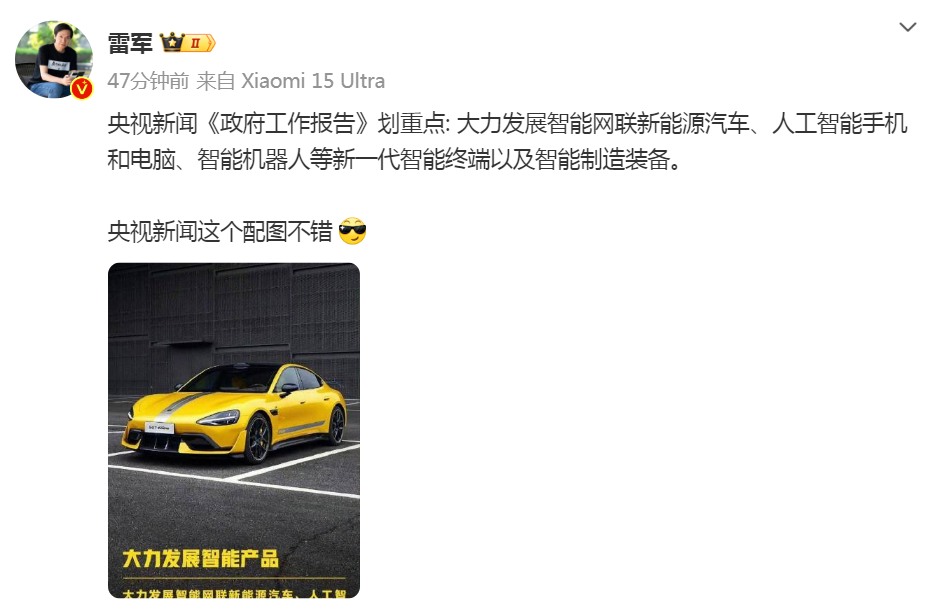 3月6日下午,雷军在个人微博上发文,点赞央视新闻微博配图: