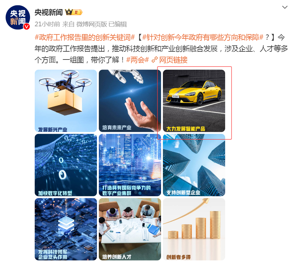 央视新闻《政府工作报告》划重点: 大力发展智能网联新能源汽车、人工智能手机和电脑、智能机器人等新一代智能终端以及智能制造装备。央视新闻这个配图不错!