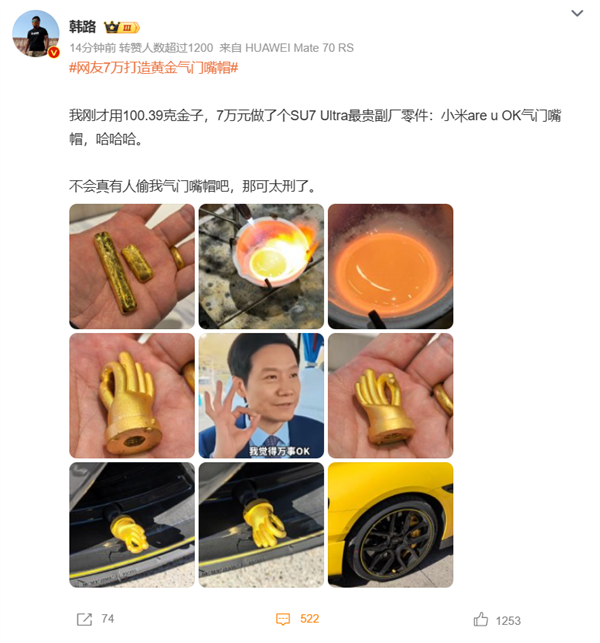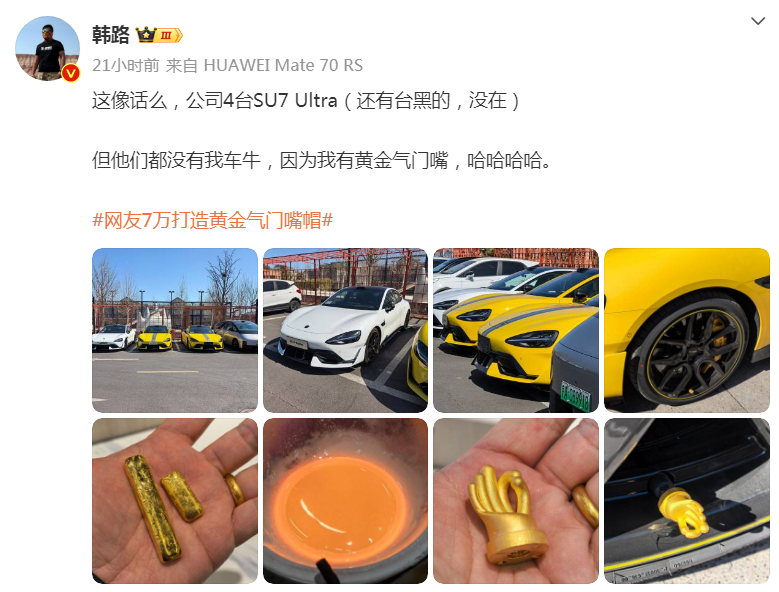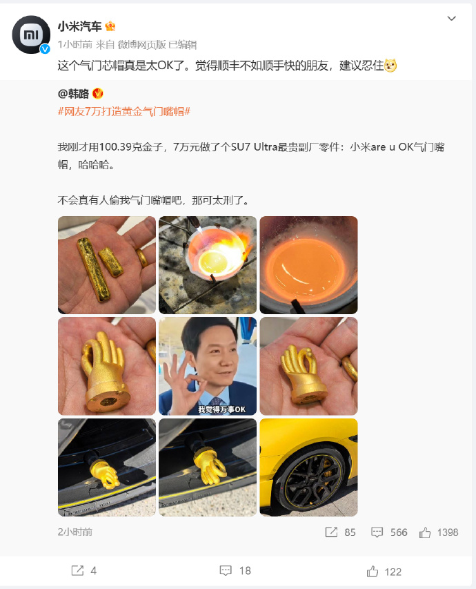 3月6日,汽车博主@韩路发文称,“我刚才用100.39克金子,7万元做了个SU7 Ultra最贵副厂零件小米are u OK气门嘴帽,不会真有人偷我气门嘴帽吧,那可太刑了。”