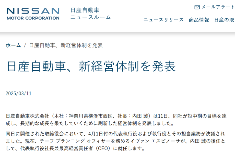 3月11日,日产汽车宣布,公司当日召开董事会会议,决定总裁兼首席执行官内田诚将于3月底卸任,继任者为公司首席规划官伊万·埃斯皮诺萨(Ivan Espinosa),4月1日起生效。