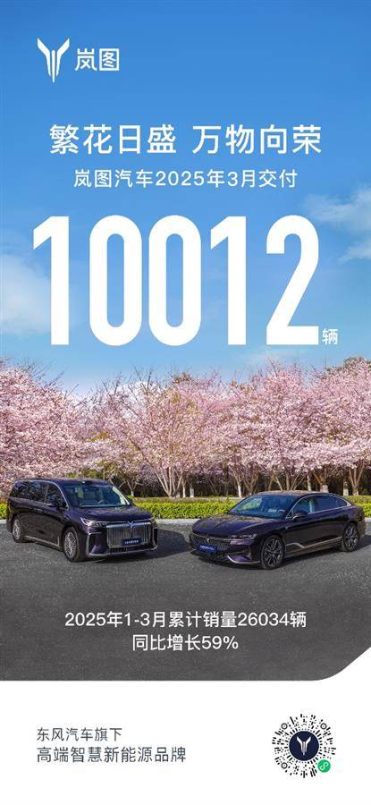 湖北日报讯(记者左晨、通讯员张莹莹)“3月销量再度破万,4月我们累计产量即将突破20万大关。”4月1日,岚图汽车公布最新销量数据,岚图汽车CEO卢放说。数据显示,3月,岚图汽车销量达10012辆,同比增长64%。1-3月,岚图汽车累计销量达26034辆,同比增长59%。销量背后,是岚图汽车加速出海的步伐。