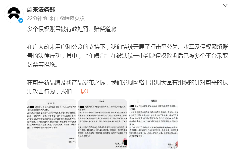 在蔚来新品牌及新产品发布之际,我们发现网络上出现大量有组织的针对蔚来的抹黑攻击行为,我们已对多个网络账号采取措施,现公布部分维权案件进展如下: