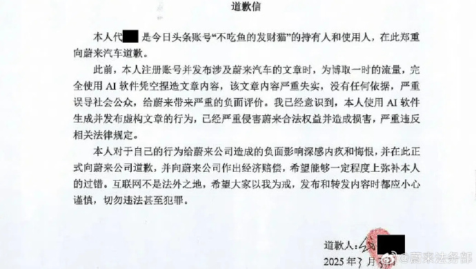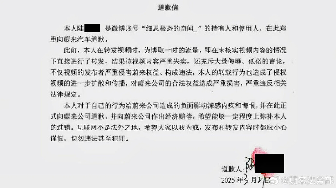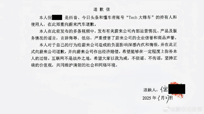 (2)侵权网络账号“Tech大锋车”持有人倪某、“细思极恐的奇闻_”持有人陆某、“不吃鱼的发财猫”持有人代某等恶意散布蔚来公司运营状况、产品及服务等虚假信息,经蔚来采取法律行动后,三个网络账号的持有人均已承认其违法行为,并已对蔚来道歉、赔偿。随附为道歉信。
