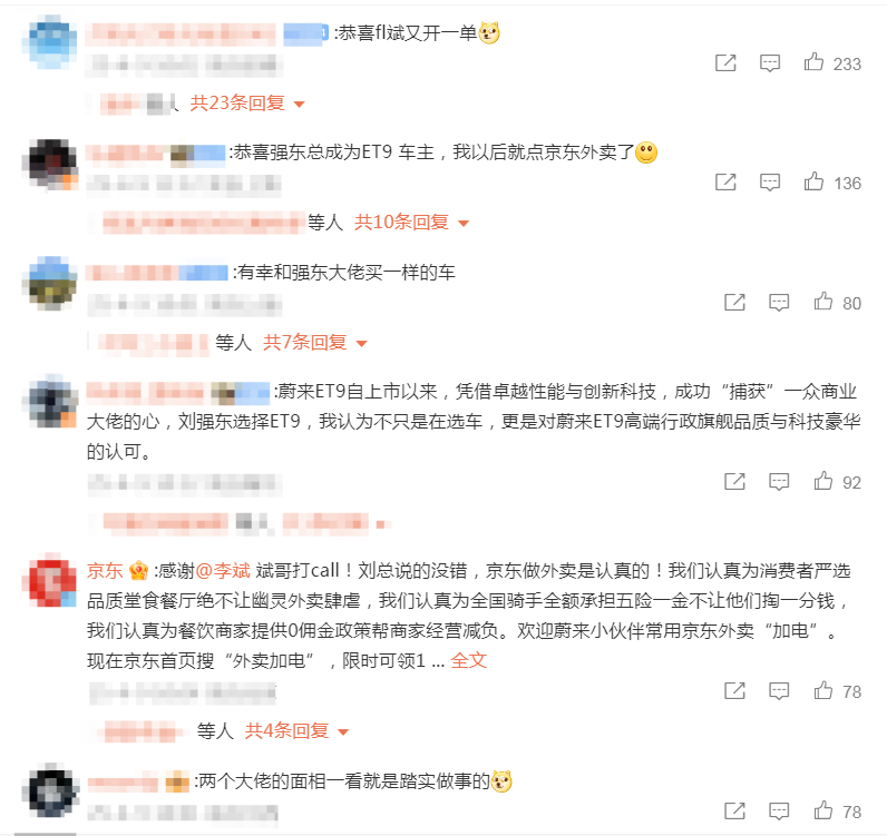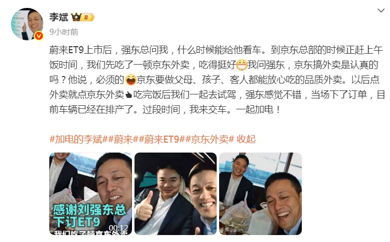 4月9日消息,蔚来汽车创始人、董事长李斌发布微博表示,京东集团创始人刘强东已经下定了蔚来最新旗舰轿车ET9,过段时间他将亲自交车。