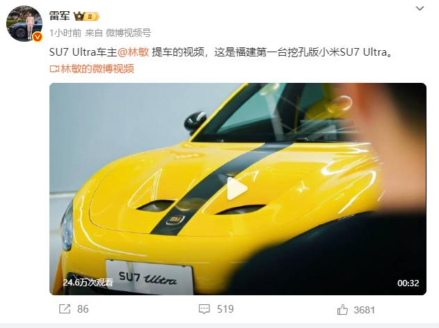 4月28日,全网首批、福建首台挖孔版小米SU7 Ultra车主林敏在微博晒出了自己的提车视频,随后得到了雷军的转发。
