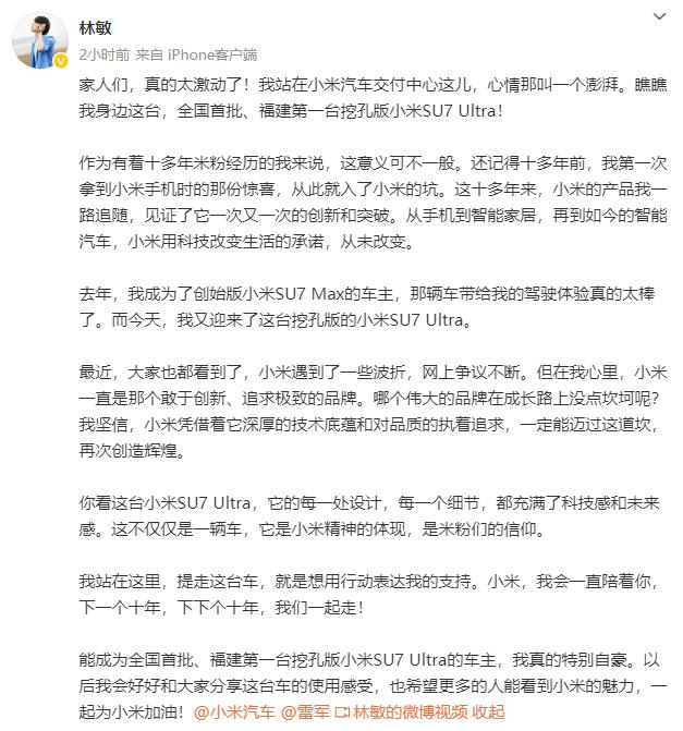 车主林敏发长文表示:“十多年米粉再次冲了!全网首批、福建首台挖孔版小米SU7 Ultra提车!风波当前,更坚信小米的技术与坚持。从初代手机到性能座驾,热爱从未褪色,继续陪跑下一个十年!”