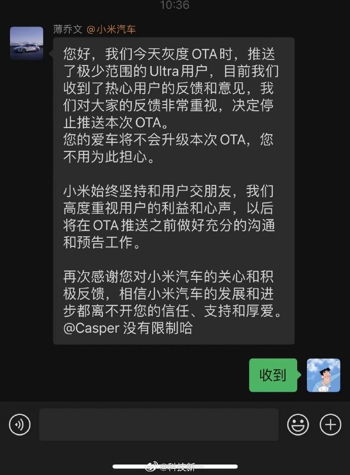 5月2日,多名小米汽车工作人员统一回应,该OTA升级并未继续进行推送。可以说,这算是一次内部的灰度测试,可能也是受到了车主的反对,最终官方选择了撤包。