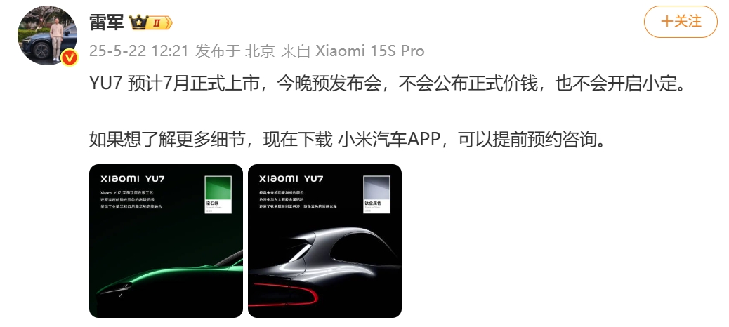 5月22日,雷军发布微博表示,小米YU7 预计7月正式上市。今晚预发布会,不会公布正式价钱,也不会开启小定。可通过小米汽车APP,了解更多细节,提前预约咨询。