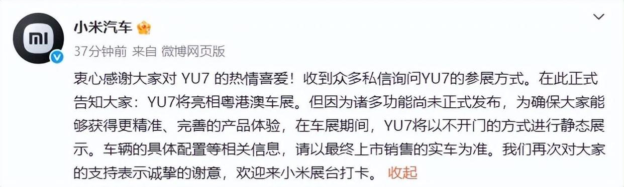 今天下午,小米再发文回应,称收到众多私信询问YU7的参展方式。在此正式告知大家:YU7将亮相粤港澳车展。但因为诸多功能尚未正式发布,为确保大家能够获得更精准、完善的产品体验,在车展期间,YU7将以不开门的方式进行静态展示。车辆的具体配置等相关信息,请以最终上市销售的实车为准。我们再次对大家的支持表示诚挚的谢意,欢迎来小米展台打卡。
