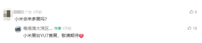有网友在评论区提问:“小米会参展吗?”对此,“粤港澳大湾区车展”官方回复:“小米展台YU7首展,敬请期待。”