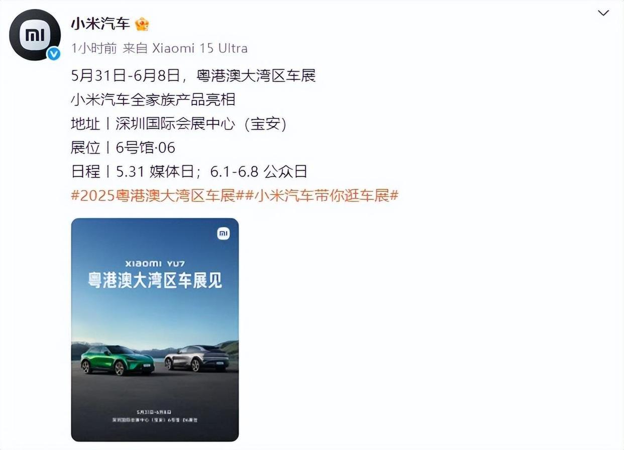 5月26日,@小米汽车 发文称,5月31日-6月8日,粤港澳大湾区车展,小米汽车全家族产品亮相。