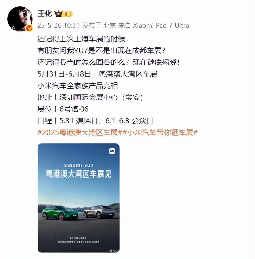 随后,小米公关部总经理@王化 发文回应称:“还记得上次上海车展的时候,有朋友问我YU7是不是出现在成都车展?还记得我当时怎么回答的么?现在谜底揭晓!”
