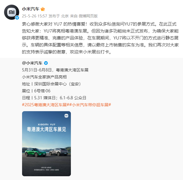 “衷心感谢大家对 YU7 的热情喜爱!收到众多私信询问YU7的参展方式。在此正式告知大家:YU7将亮相粤港澳车展。