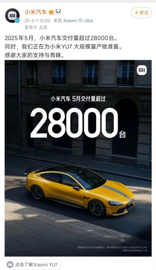 86月1日,小米汽车发文称,2025年5月,小米汽车交付量超过28000台。同时,正在为小米YU7大规模量产做准备。