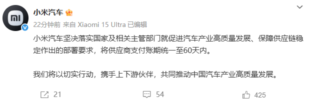 今日上午,小米官方微博发文称:“坚决落实国家及相关主管部门就促进汽车产业高质量发展、保障供应链稳定作出的部署要求,将供应商支付账期统一至60天内。我们将以切实行动,携手上下游伙伴,共同推动中国汽车产业高质量发展。”