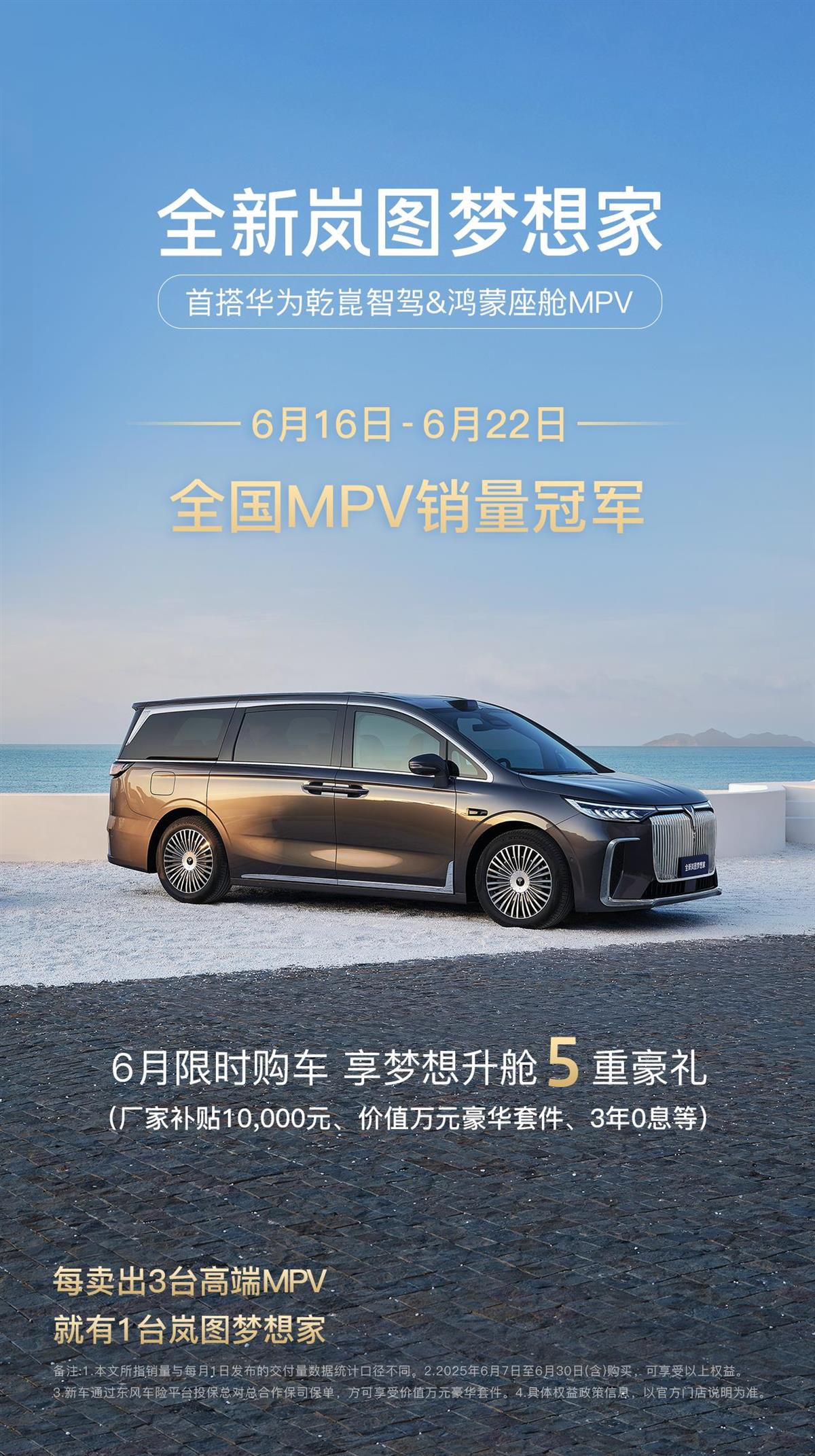 6月第三周(6月16日-22日)MPV周销量榜单揭晓!岚图梦想家凭借强大的产品力,以单周2720台再夺MPV销量冠军,持续巩固细分市场标杆地位!不仅超越腾势D9、高山等新能源对手,更将GL8、赛那等传统燃油MPV甩在身后,岚图梦想家以碾压之势改写整个MPV市场格局!