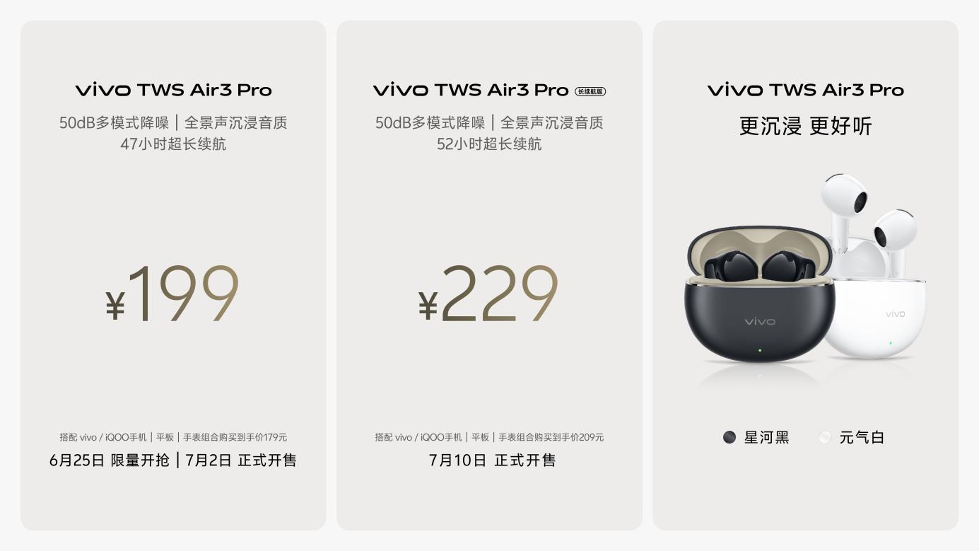 vivo TWS Air3 Pro 具备"星河黑"与"元气白"两款配色,标准版上市价格 199 元,6月25日发布会后限量开抢,7 月 2 日正式开售;长续航版上市价格 229 元,现已开启预售,7 月 10 日正式开售。7 月 31 日前,vivo TWS Air3 Pro 标准版和长续航版搭配 vivo/iQOO 手机、平板、手表产品组合购买,均立减 20 元。