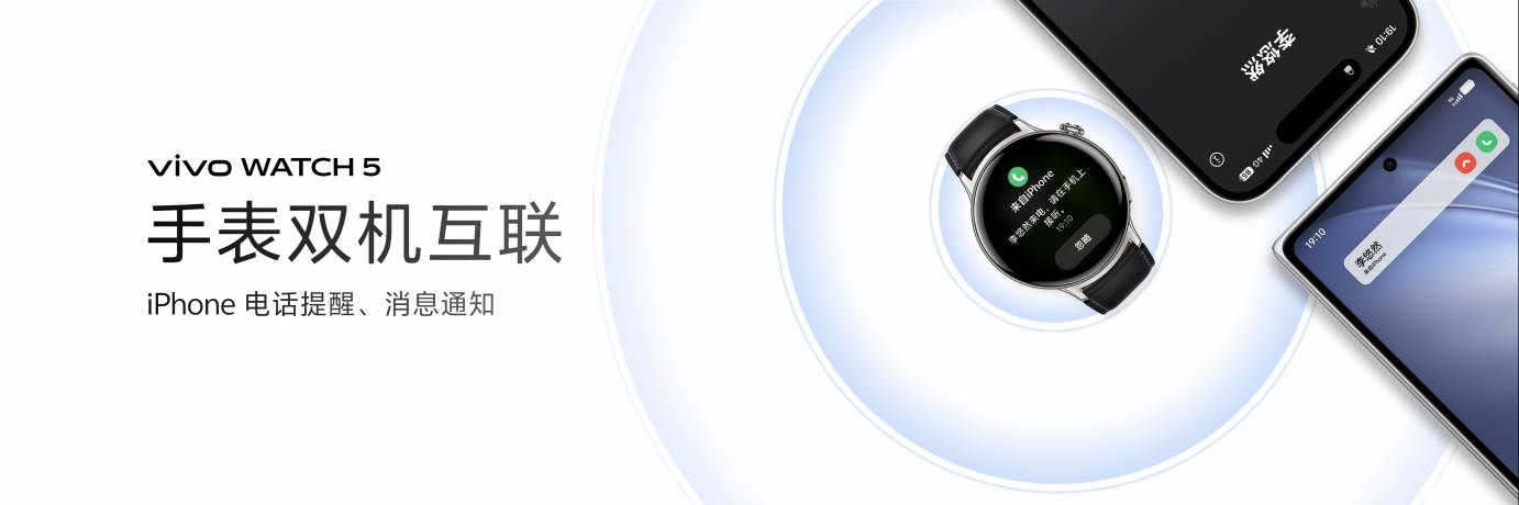vivo WATCH 5 搭载全新蓝河操作系统,Jovi 语音升级为蓝心小 V,支持知识问答与任务创建;具备 AI 智慧视窗,及时推送各类相关通知,重要信息抬腕即现;全新升级“手表双机互联”,在 vivo 手机与 iPhone 双机互联下,两款手机的来电、短信、微信等通知都会在手表上通知,统统不错过。