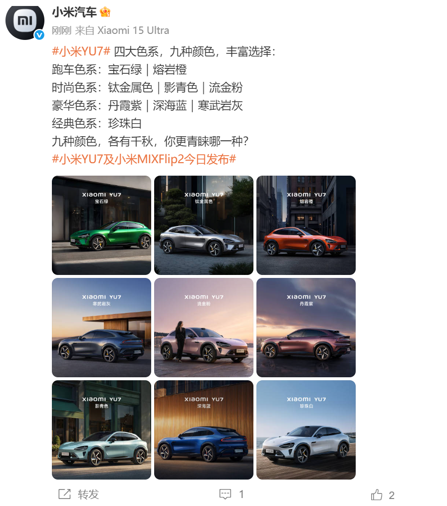 小米YU7共四大色系,九种颜色,丰富选择:跑车色系:宝石绿、熔岩橙;时尚色系:钛金属色、影青色、流金粉;豪华色系:丹霞紫、深海蓝、寒武岩灰;经典色系:珍珠白。