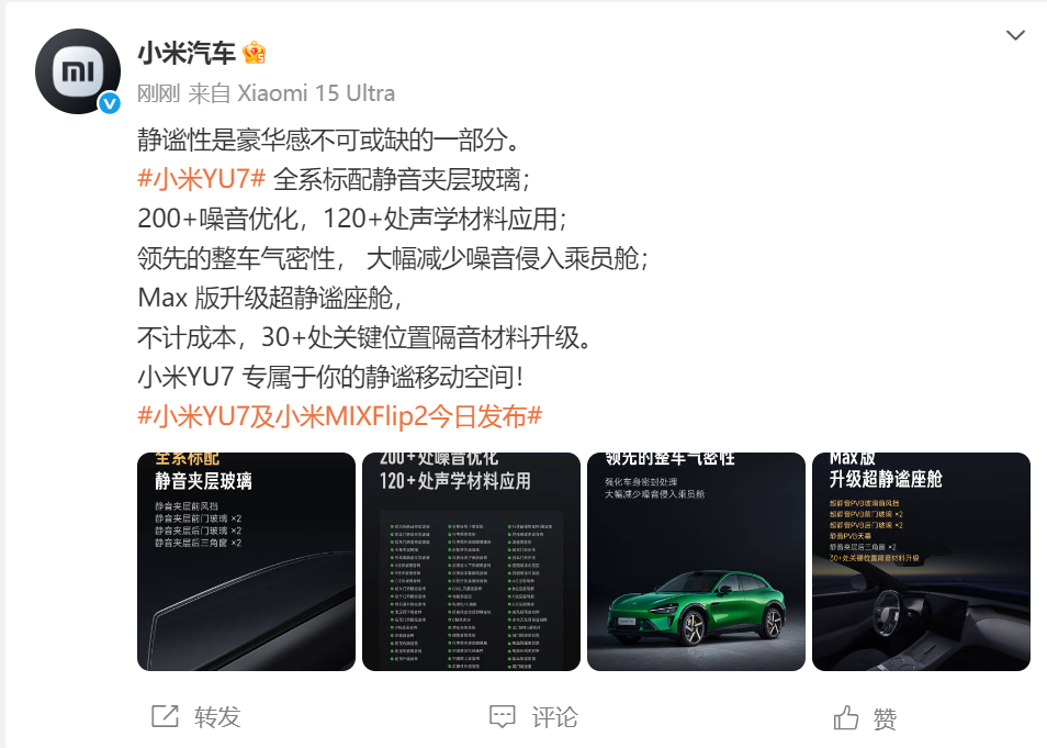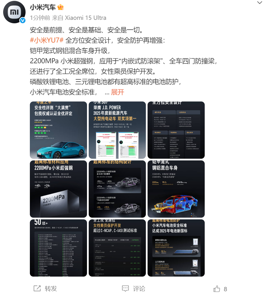 小米YU7全方位安全设计,安全防护再增强:铠甲笼式钢铝混合车身升级,2200MPa 小米超强钢,应用于“内嵌式防滚架”、全车四门防撞梁,还进行了全工况全席位,女性乘员保护开发。磷酸铁锂电池、三元锂电池都有超高标准的电池防护,小米汽车电池安全标准,达成2025年电池新国标!