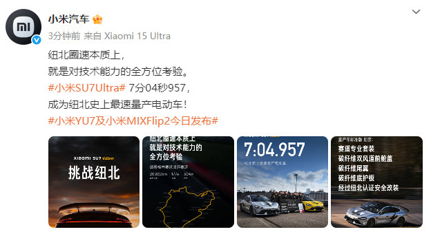 26日晚,小米汽车发文:#小米SU7Ultra# 7分04秒957,成为纽北史上最速量产电动车!