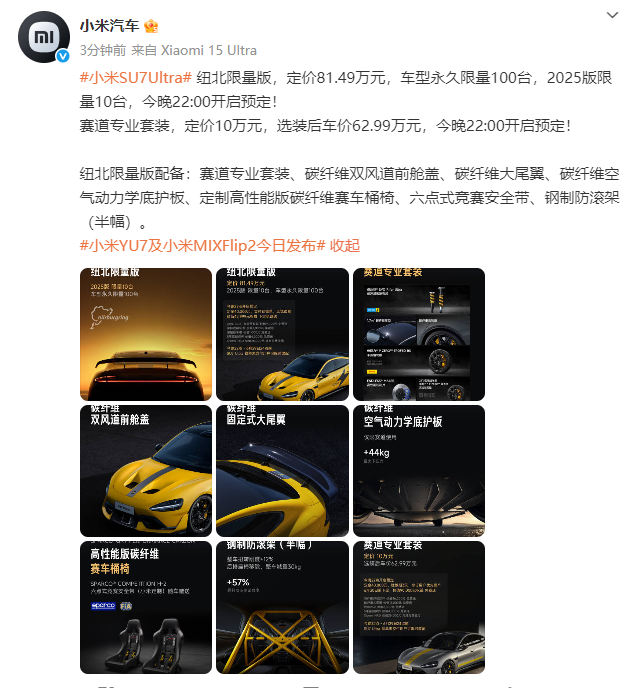 纽北限量版,定价81.49万元,车型永久限量100台,2025版限量10台,今晚22:00开启预定。