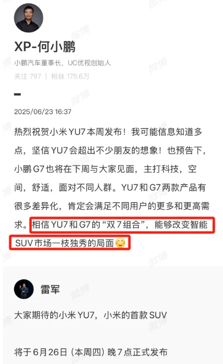 多家车企掌门人在YU7发布前夕相继称,其产品与YU7是差异化竞争。6月23日,小鹏汽车CEO何小鹏发布微博称,YU7和G7有很多差异化之处,会满足不同用户更多和更高的需求。