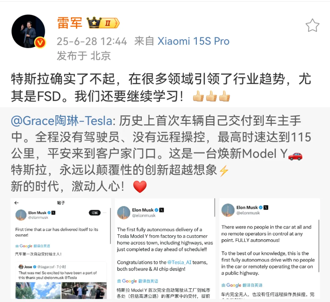 雷军发布微博祝贺特斯拉并表示:“特斯拉确实了不起,在很多领域引领了行业趋势,尤其是FSD(特斯拉研发的自动驾驶系统)。我们还要继续学习!”