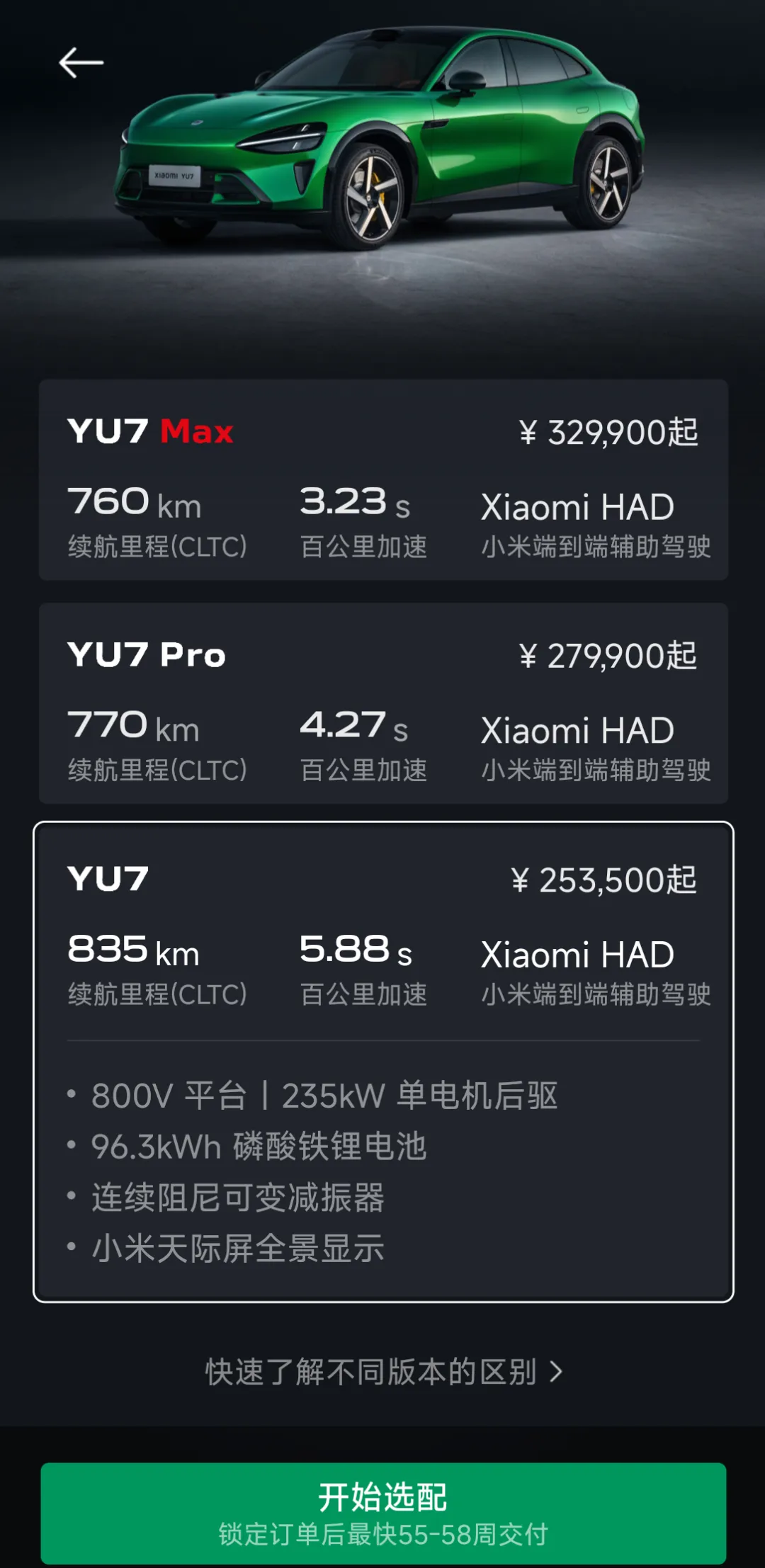 小米汽车App更新YU7的交付时间显示,锁单后标准版预计最快55周至58周、Pro版预计最快49周至52周、Max版预计最快34周至37周。