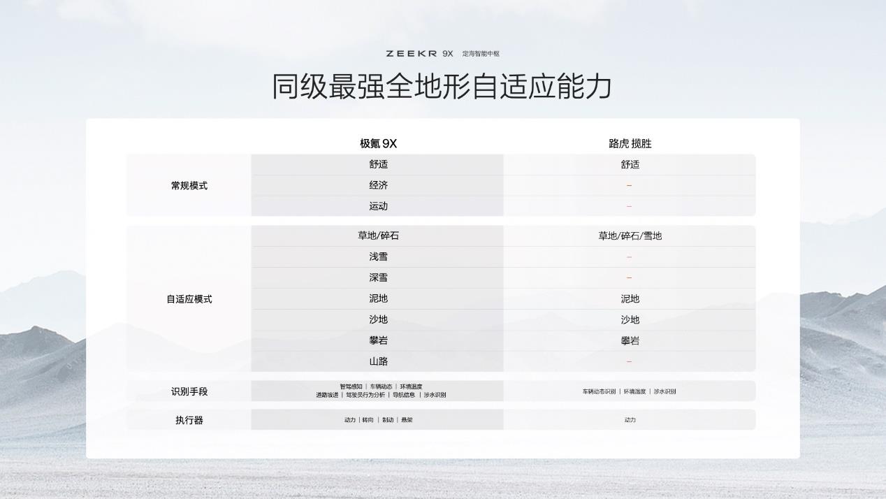 极氪9X还拥有比肩百万级豪华SUV的全地形通过能力。在日常路况可智能匹配三种常规驾驶模式外,极氪9X还可自动识别7种特殊地形,旗舰SUV中最多,实时智能匹配专属驾驶模式,实现强大的全地形自适应驾驶能力。极氪9X在没有任何铺装道路的情况下,成功征服戈壁、砂石、草地、雪地等各种地形,还在高海拔、大温差、氧气极度稀薄的环境中,完成了涉水、爬坡等各种挑战,成功穿越进藏难度系数最高的“克里雅古道”,抵达海拔超过5000米的无人区,以巅峰表现真实验证了浩瀚AI数字底盘的强悍能力。